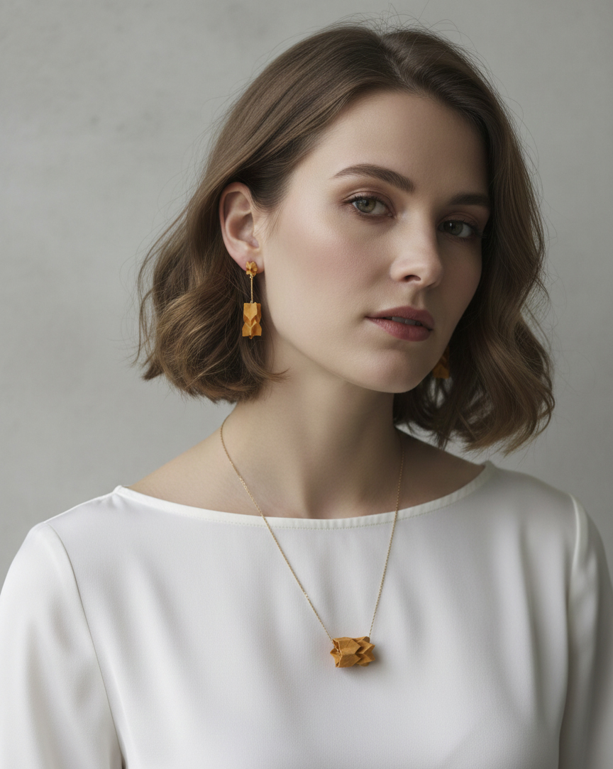 «Llevo el arte del origami más allá del papel, aplicando tratamientos especiales a la tela para esculpir formas geométricas firmes y duraderas. Cada pliegue se realiza a mano con precisión milimétrica, transformando la suavidad del tejido en una joya estructural que mantiene su forma perfecta día tras día.»